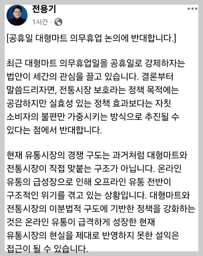 그러나 민주당 의원이라고 해서 대형마트 공휴일 의무휴업에 다 찬성하는 것은 아니다. 전용기 의원은 대형마트 의무휴업일을 공휴일까지 확대하는 것에 대해 "신중하게 검토되어야 한다"는 입장을 밝혔다. 향후 국회에서 사업자와 노동자, 소비자의 입장을 충분히 들어가며 결정할 문제다.