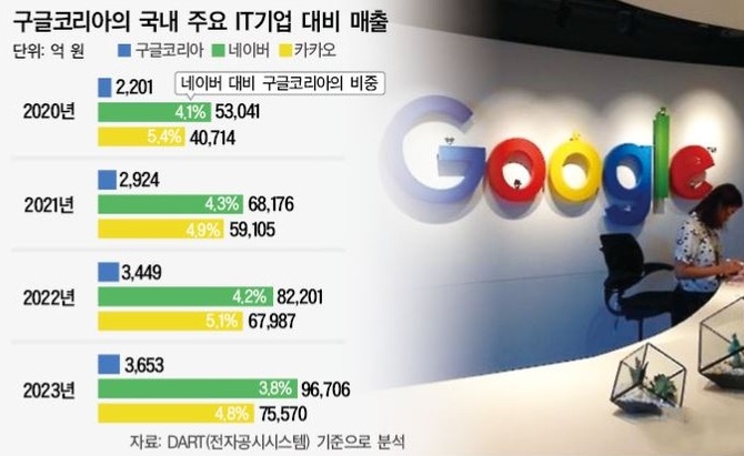 2024년 4월에 공시된 구글코리아 감사보고서에 따르면 2023년도 매출액은 3,653억 원이고, 구글이 국내에 납부한 법인세는 155억 원이다. 참고로 네이버의 2023년 매출은 9조6,706원으로 법인세 4,964억 원을 납부했다. 그런데 구글코리아의 실제 국내영업 실적은 어느정도일까? 한국재무관리학회가 발표한 '해외 빅테크 기업 한국법인의 매출액 및 법인세 추정' 보고서(2024.9월)에 따르면 최대 12조 1,350억 원으로 추정된다. 이를 기준으로 법인세를 납부한다면 최대 5,180억원이다.