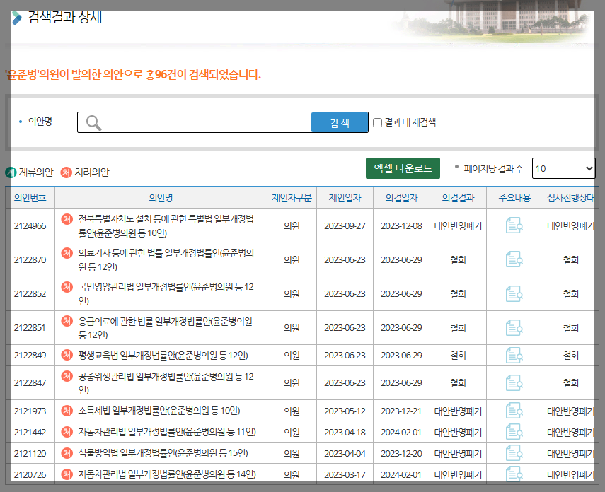 국회 홈페이지 의안정보시스템에서 윤준병 의원 처리법안을 검색해보면 위 결과처럼 총 96건이 검색된다. 윤준병 의원의 처리법안 목록 전체는 입법 데이터 대시보드 「잠자는 국회」에서 편리하게 확인할 수 있다.