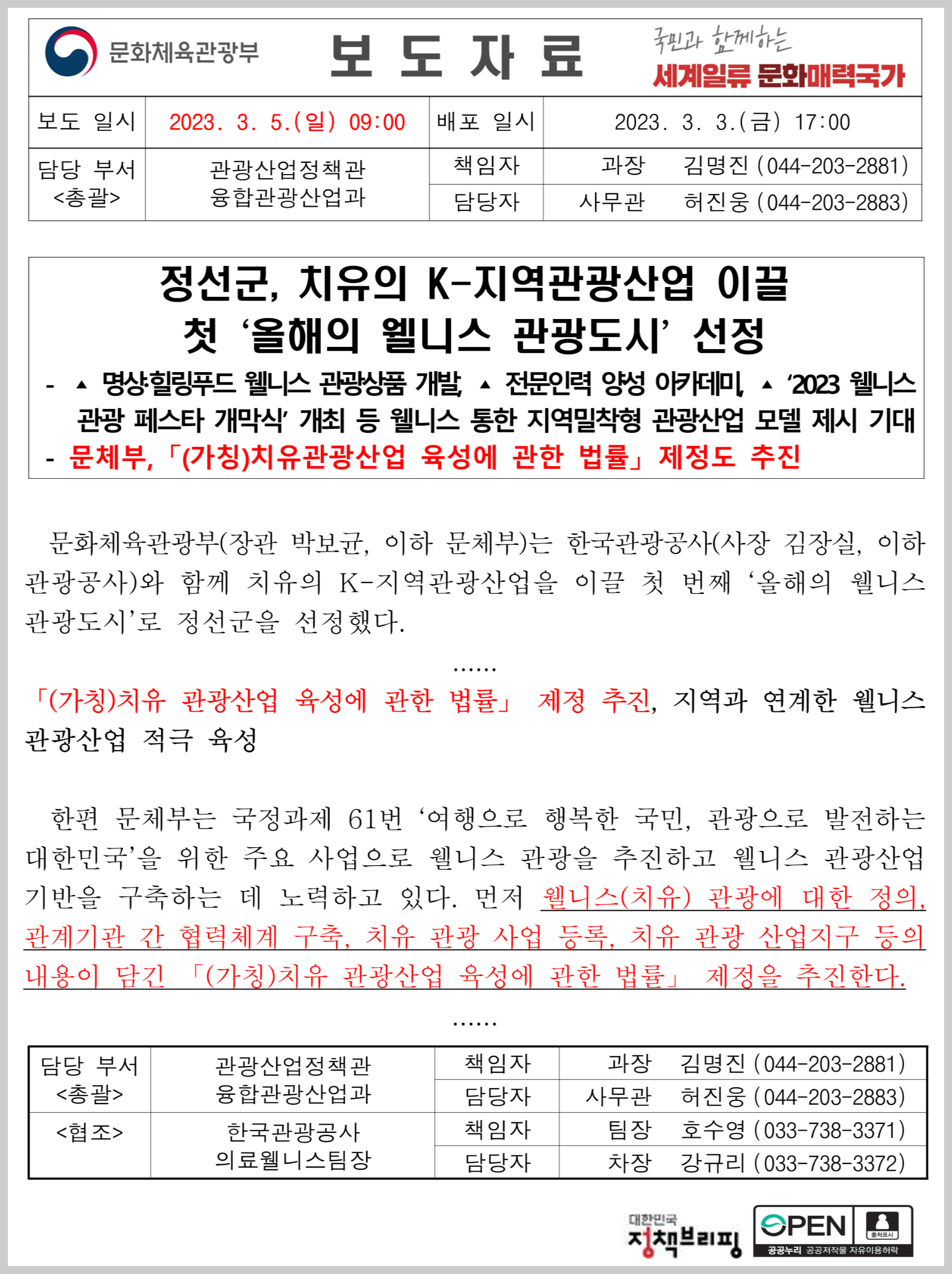 보다시피 문체부는 2023년 3월 5일에 치유관광산업 육성법 제정을 추진하겠다는 계획을 문체부 보도자료 형식으로 발표했고, 그 후 약 1주일 뒤인 3월 13일에 배현진 의원이 이 법안을 발의했다. 청부입법으로 의심되는 대목이다.