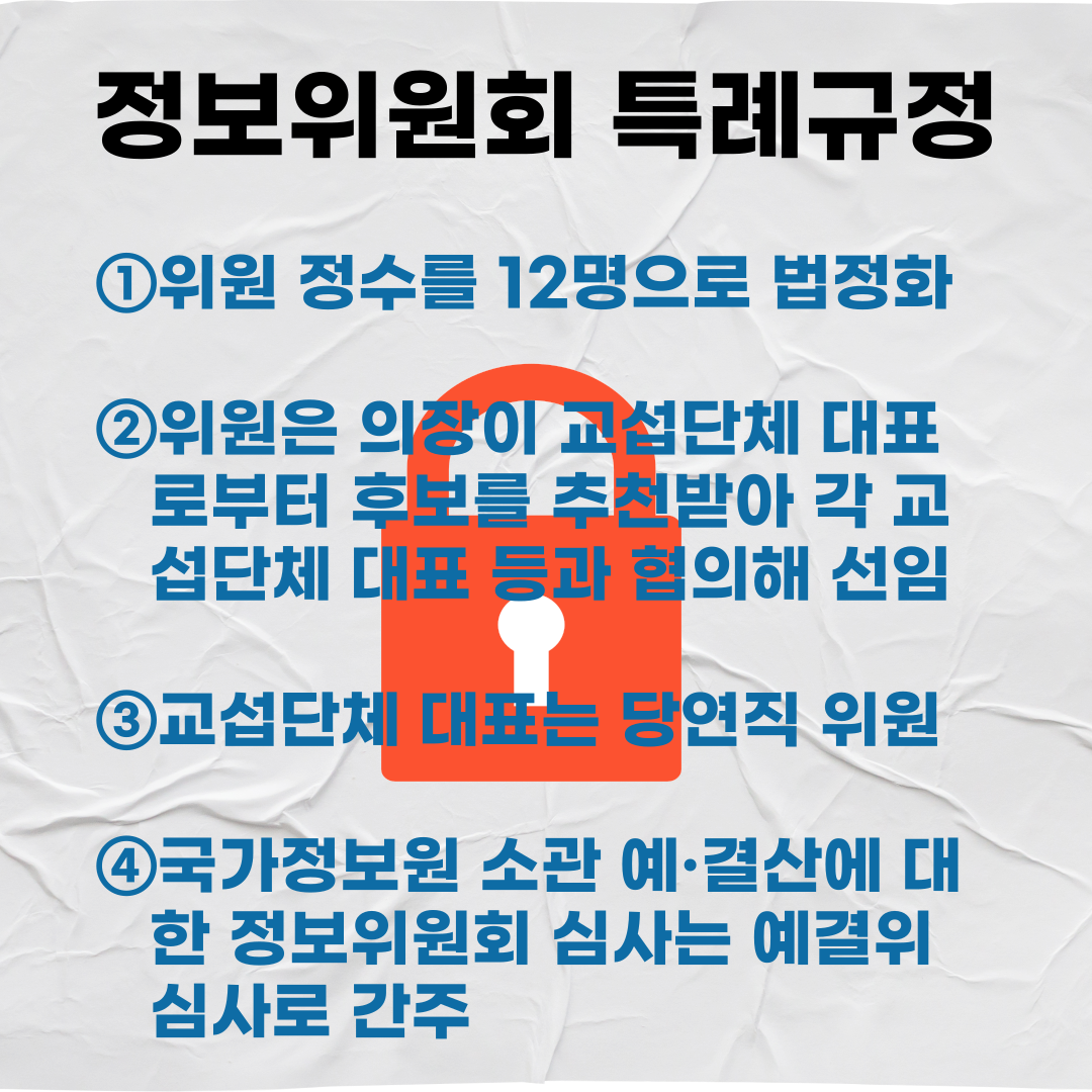 우선, 정보위원회의 정수는 「국회법」에서 12명으로 못박았다. 다른 상임위 정수는 국회규칙으로 정하는 반면, 정보위 정수를 국회법으로 묶어둔 것은 업무의 특성상 정치적 이해관계에 따라 위원 정수를 바꾸지 못하도록 한 것이다. 또한 정보위원회 회의는 비공개다. 정보위원회 위원 및 소속 공무원은 직무상 알게 된 국가기밀 사항을 공개·누설 하면 안된다. 예산·결산 심사도 정보위원회 자체의 심사로 끝난다. 예·결산에 대한 총액만 예산결산특별위원회에 통보하고 예결위가 별도로 심사하지 않는다.