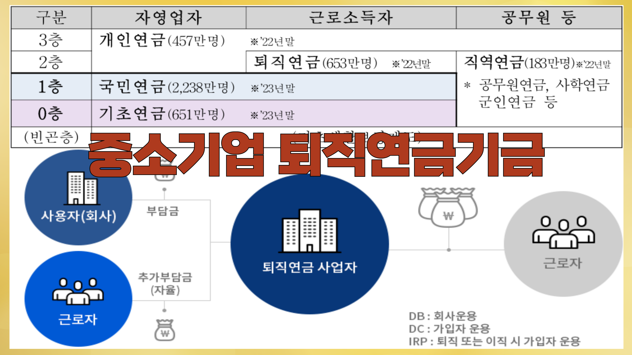 중소기업 퇴직연금기금 제도(중퇴기금제도)는 사업주와 근로자가 납입한 부담금으로 공동의 기금을 조성·운영하여 근로자에게 퇴직급여를 지급하는 제도다. 다른 제도와 달리 일정부분 재정이 지원된다. 따라서 대상도 상시근로자 30인 이하 중소기업으로 제한하고 있다.
