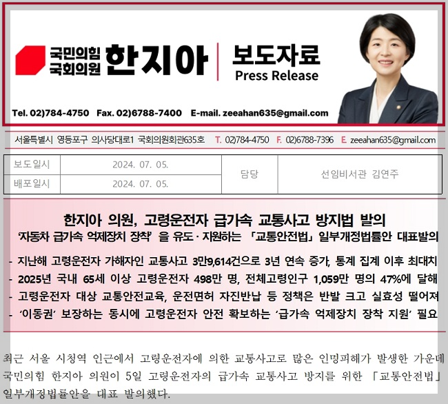 한지아 의원은 교통안전법 개정안을 발의하면서 보도자료를 통해 '고령운전자 급가속 교통사고 방지법'이라고 이름을 붙였다. 시청역 참사가 있은지 불과 몇일 안된 때라 그런지 언론도 한지아 의원의 법안에 많은 관심을 보였다.