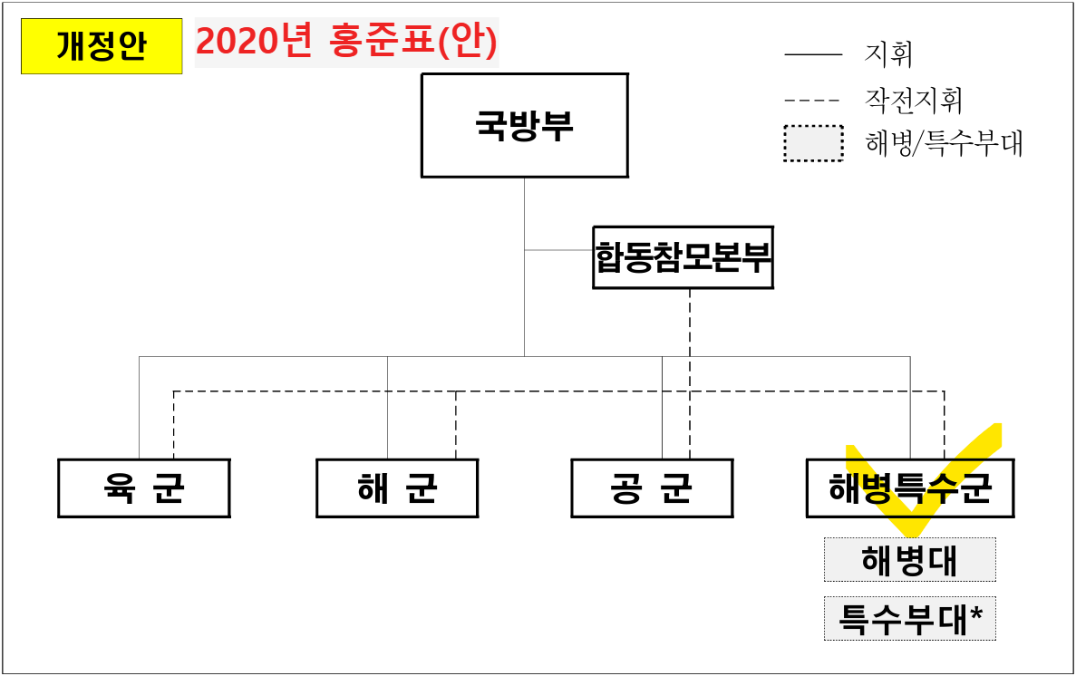 위에서 보는 것처럼 현행 3군체제에서 해병대를 독립하여 4군체제로 재편하고 각군의 주임무에서 해병대의 임무를 별도로 규정하는 방식이다.